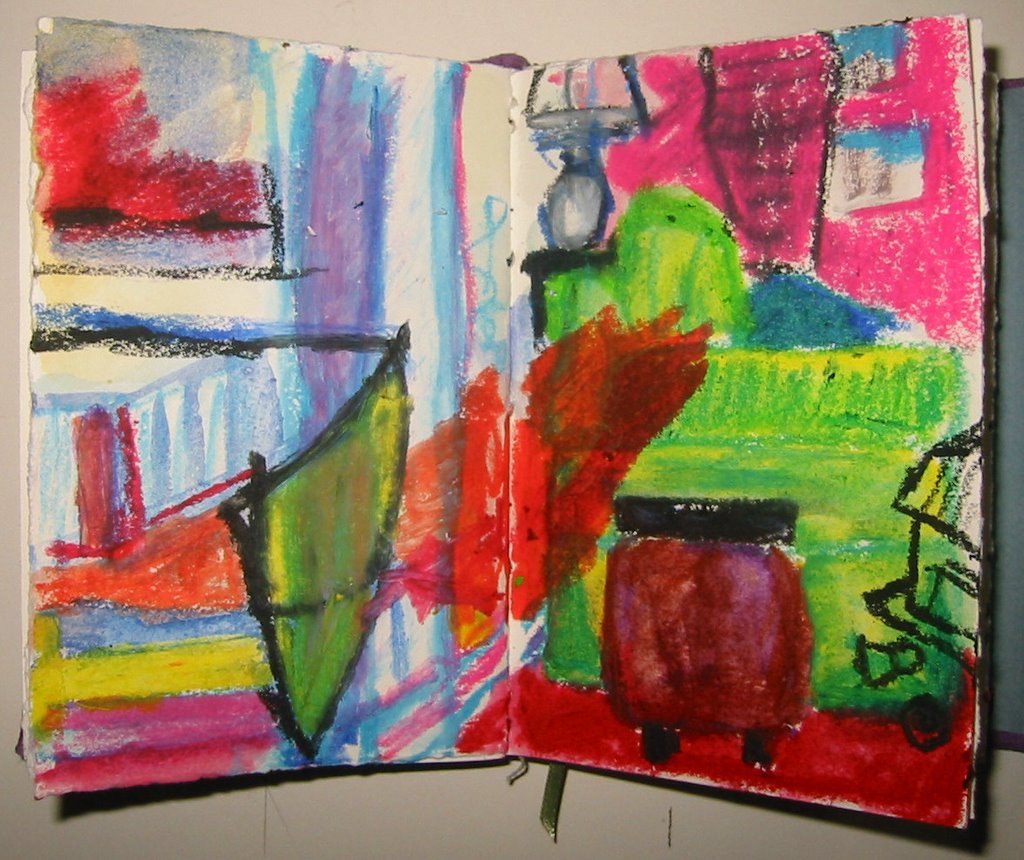 As I was drawing a corner of the living room, the water-soluble oil pastels just sort of took over! The silkiness was irresistable. I am eager to get more colors so I can get some (perhaps any?) subtlety. Backyard Bread
